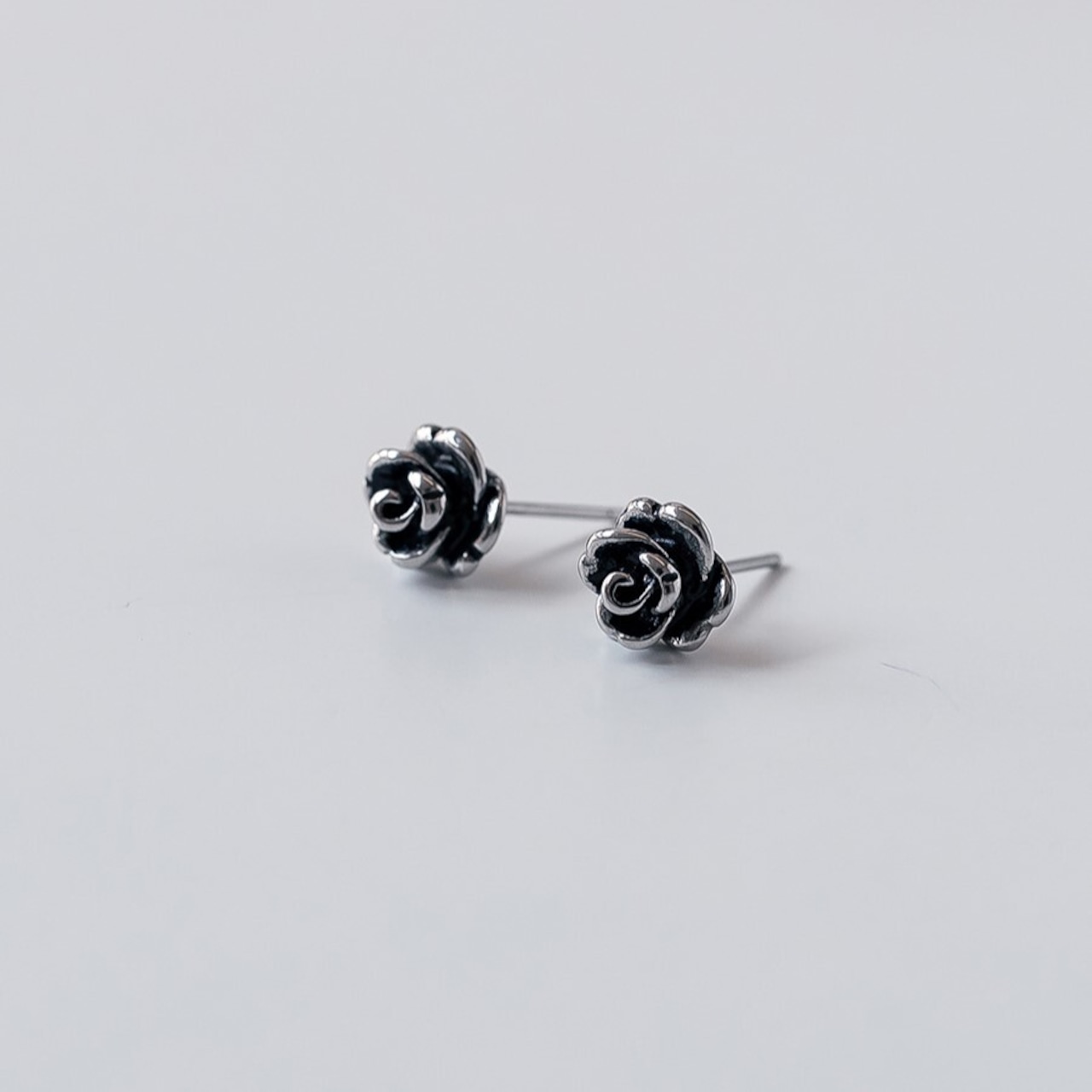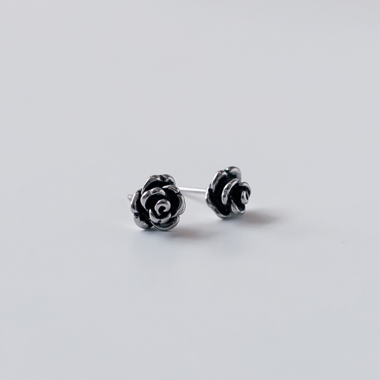 薔薇の花びら1枚1枚にバーニング処理を施し、アンティークでヴィンテージな雰囲気を存分に引き出したピアス